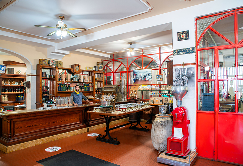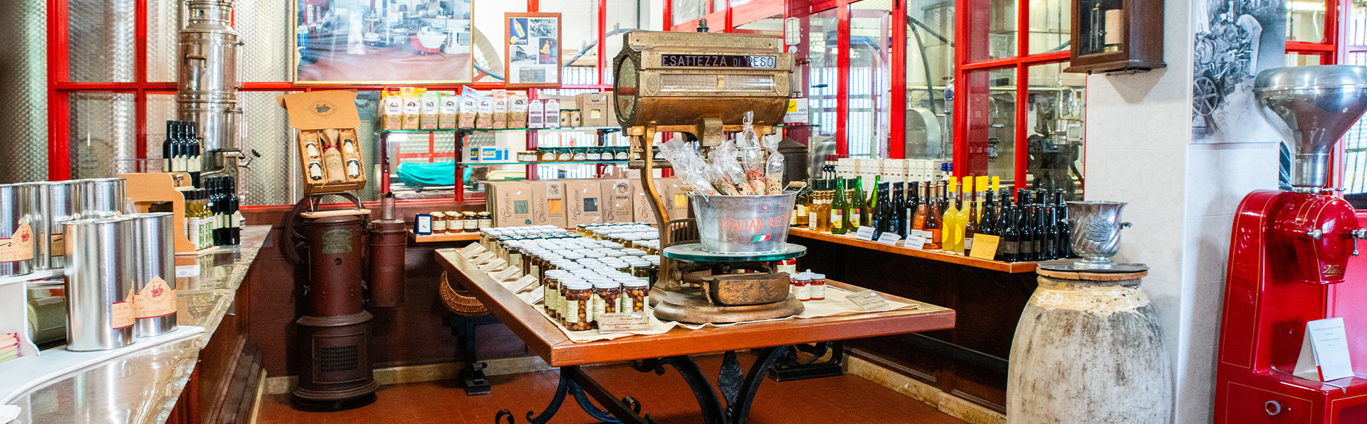 Sembra di entrare in una stazione ferroviaria degli anni ‘30, dominata da ampie vetrate con infissi ad arco di un colore rosso brillante, sul fondo le due molazze in pietra del frantoio, nello stesso posto da ben 65 anni.